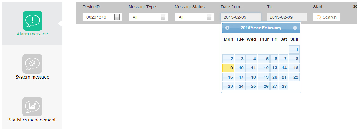 5.Search Users can search the alarm messages within a certain period of time. Enter the camera name, select the time period, the message type, and click on the "Search" button;