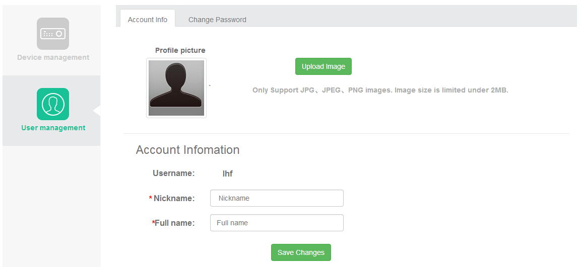 Configuration management> User information management, click the "Account Information" to modify the account information (nickname, real name), and user can upload a picture as profile picture.